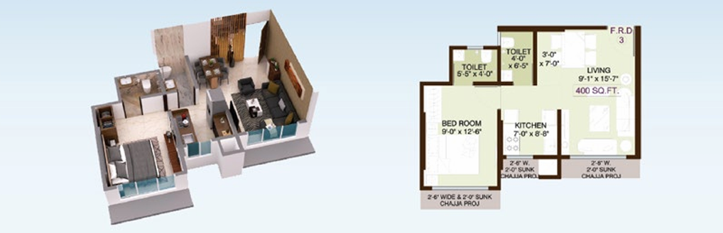 1BHK Isometric View ( RERE AREA - 400.00 sft)